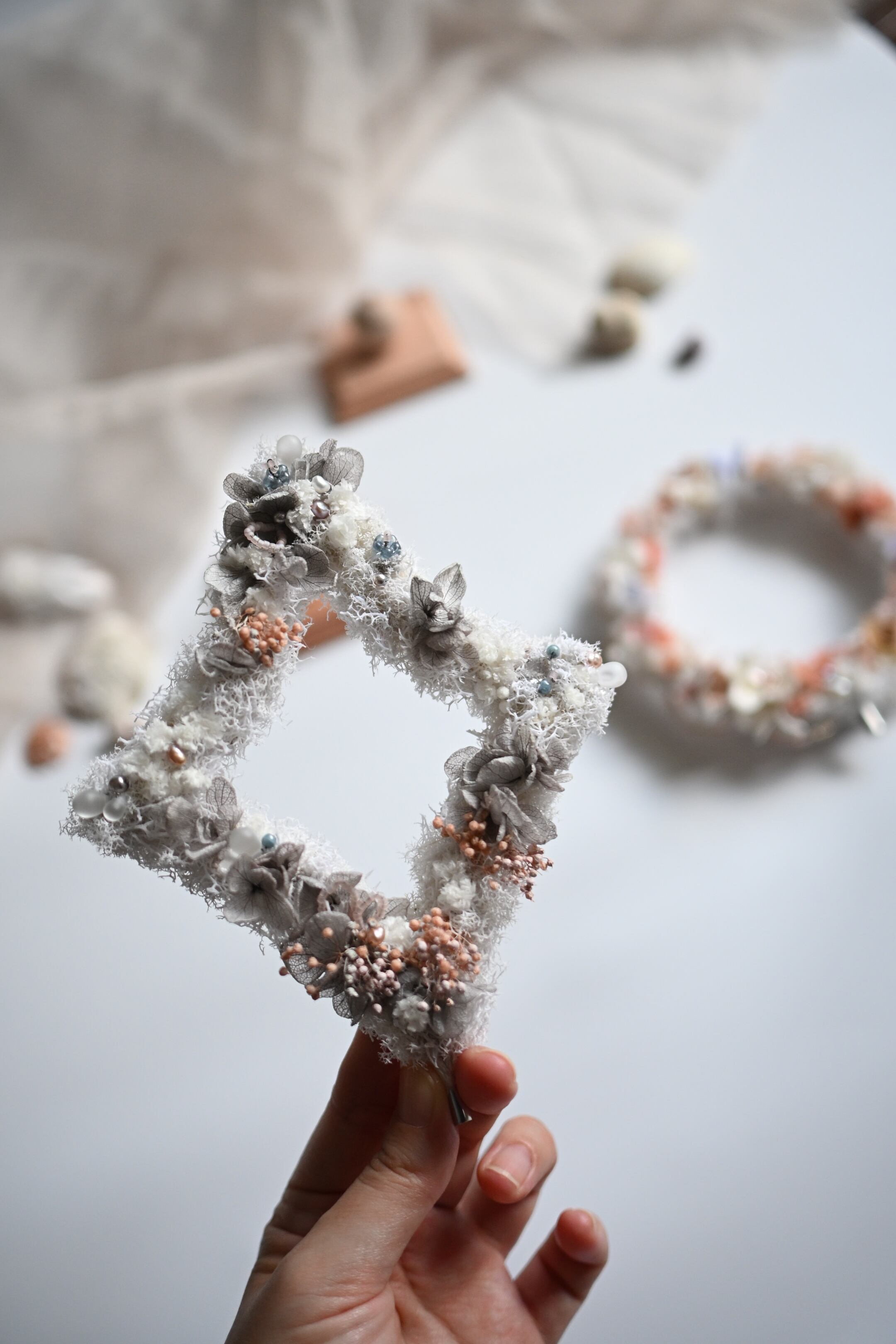 柔らかなフィンランドモス、カスミソウ、アジサイのプリザーブドフラワー、